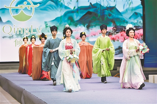 图为在山东省菏泽市曹县e裳小镇数字经济产业园,模特在曹县汉服2025春夏新品发布会上走秀。