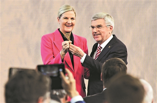 托马斯·巴赫和柯丝蒂·考文垂(左)在主席职位交接仪式上。新华社记者 连漪 摄