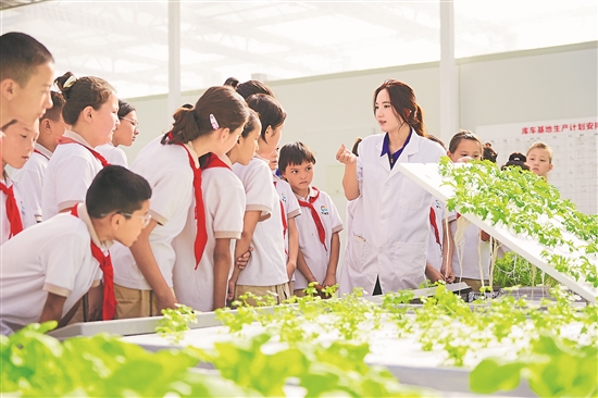 6月25日,在新疆阿克苏地区库车市甬库同心村智慧农业植物工厂,工作人员为当地小学生讲解无土栽培技术。