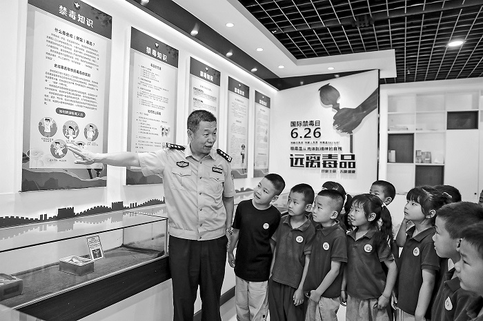 6月23日,在山东省青岛市李沧区青少年禁毒宣传教育基地,民警为小朋友介绍禁毒知识。