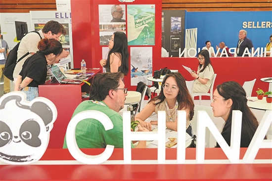 当地时间6月24日,在法国西部海滨城市拉罗谢尔,人们在第36届法国阳光国际纪录片节中国联合展台交流。新华社记者 唐霁 摄