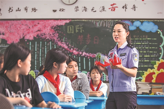 6月25日,在河南省焦作市博爱县新华小学,社区民警为学生讲解毒品危害。