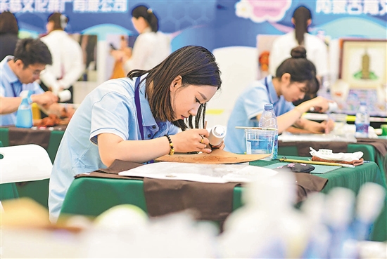 近日,在内蒙古呼和浩特市赛罕区金桥双创示范区,参赛选手在皮雕项目比赛中。