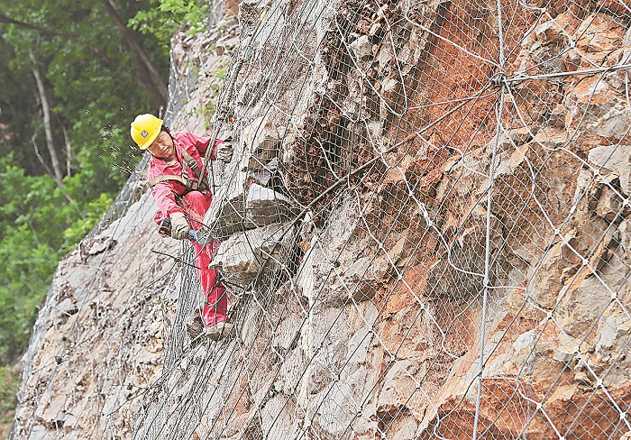 6月23日,在湖北省荆门市东宝区圣境山生态旅游区,工作人员沿着陡峭山壁开展拉网式地质灾害隐患巡查。入梅以来,当地积极应对恶劣天气,督促旅游景区全面检查地质灾害风险区域,通过“人防+技防”,加强监测预警,及时排除安全隐患,确保游客与生态安全。本报通讯员 赵平 摄