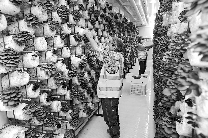 6月24日,安徽省亳州市蒙城县智慧菌菇农业产业园乐土社区基地,农民正在采收平菇。入夏以来,该基地利用智能菌菇方舱种植模式生产的平菇,源源不断地销往长三角市场,为农民增收拓宽了新途径。