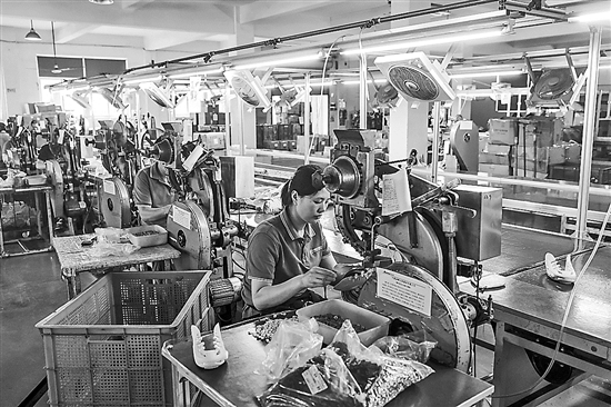 6月25日,工人在宁波金峰文体器材有限公司车间内加工出口的轮滑鞋。