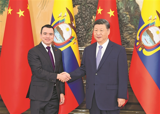 6月27日上午,国家主席习近平在北京人民大会堂会见来华出席夏季达沃斯论坛的厄瓜多尔总统诺沃亚。新华社记者 黄敬文 摄