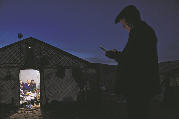 4月9日晚,在腾格里沙漠工程固沙项目区,65岁的张开科(图右)在帐篷外寻找手机信号与家人联系。