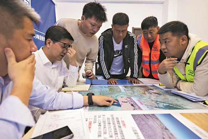 4月12日,在阿拉善左旗的一间办公室内,中铁四局城轨分公司的工程人员正在讨论防沙治沙方案。