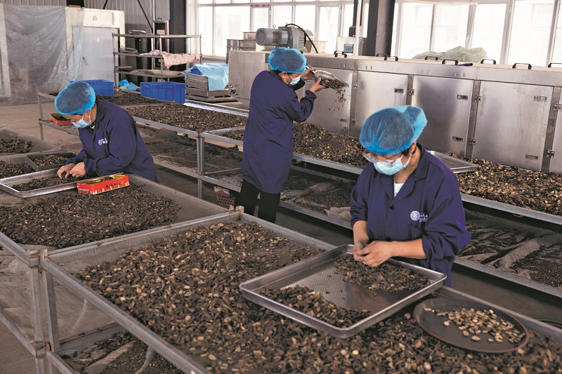 6月16日,在阿拉善左旗的一处肉苁蓉加工车间内,工人正在分拣已经切片的肉苁蓉。
