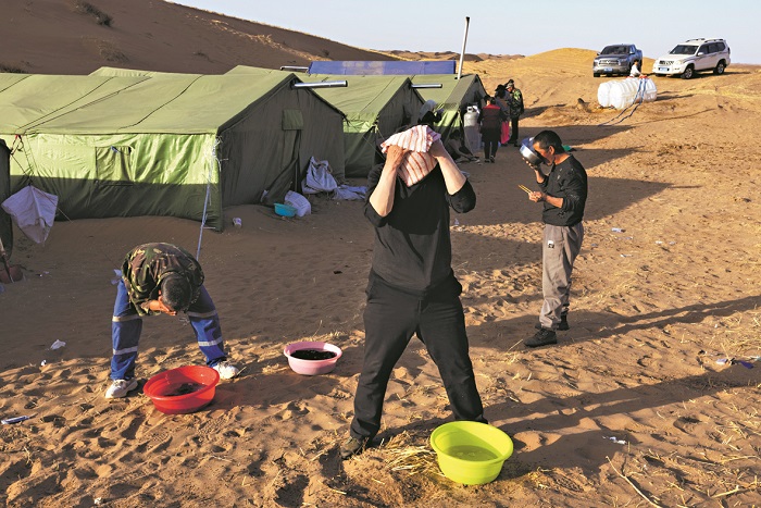4月9日,在腾格里沙漠工程固沙项目区,忙碌了一天的治沙工返回生活区清洗脸上的沙子,准备吃晚饭。