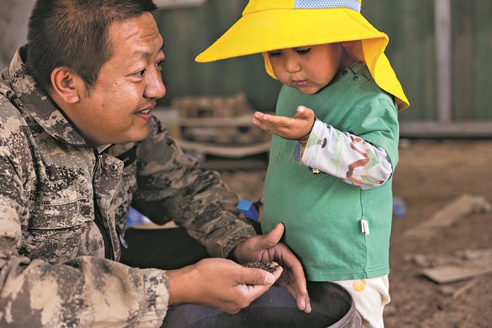 6月16日,在乌兰布和沙漠边缘的一处民房内,王刚(图左)正带着孩子在筛选肉苁蓉种子。