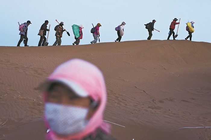 4月10日清晨,在内蒙古自治区阿拉善盟巴丹吉林和腾格里两大沙漠交汇处,当地群众分批前往治沙项目区植树。该项目区作为“三北”防护林体系建设工程的关键节点和阿拉善生态治理的核心战场,扼守着巴丹吉林与腾格里两大沙漠“握手”的咽喉要道。
