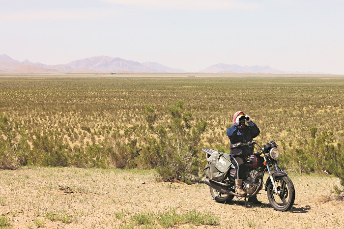 6月16日,阿拉善左旗宗别立镇,60岁的牧民斯琴高娃骑着摩托车巡护梭梭林。不远处就是著名的贺兰山脉。
