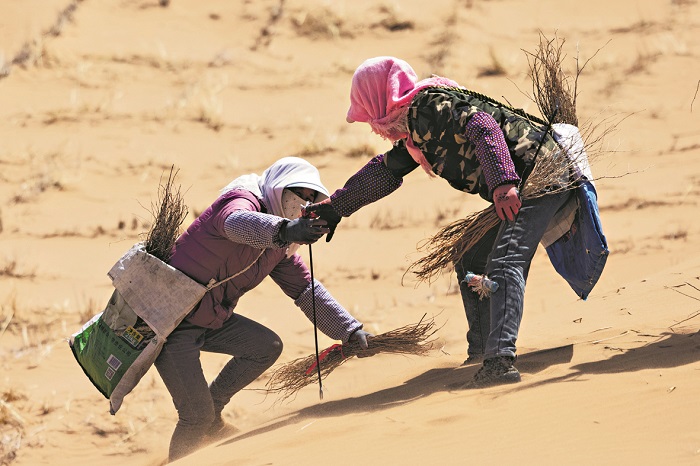 4月12日,腾格里沙漠,两名妇女背着花棒苗翻越沙丘。当地将“以工代赈”模式运用到防沙治沙工程建设中,带动当地群众就业增收。