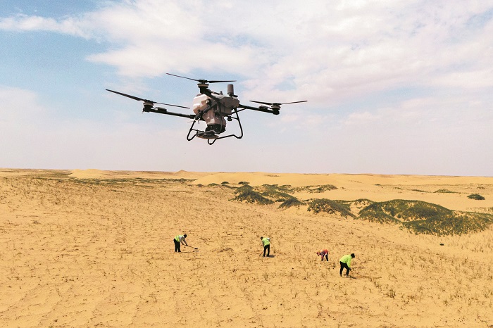 6月17日,在巴丹吉林沙漠工程固沙项目区内,来自中建一局的工程人员正操作无人机实施飞播造林。