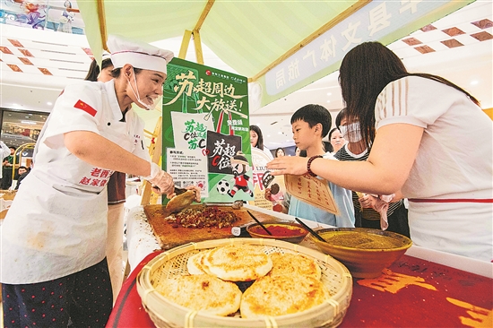 6月28日,消费者在江苏省泰州市海陵区万达广场“跟着苏超游徐州”徐州文旅(泰州)推介会上品尝食品。据悉,在江苏省城市足球联赛泰州队主场比赛期间,联赛各场次比赛购票观众和客场球队城市市民,均可享受泰州48家旅游景区免费入园等多项优惠。本次活动借赛事东风,促文旅消费。新华社发 (杨玉岗 摄)