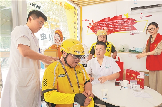 7月1日,安徽省马鞍山市花山区卫生健康委联合塘西街道社区卫生服务中心,在星悦广场新花驿站开展“暖心‘医’靠 ,‘近’享健康”党员志愿服务活动。医护志愿者们为外卖骑手们把脉问切,提供个性化健康管理指导。本报通讯员 胡智慧 摄