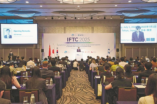 2025年中日韩合作国际论坛当地时间7月1日在日本东京举行,主题为“共塑未来:全球变局下的中日韩合作”,逾200名现场嘉宾及数百名线上观众参会。图为中日韩合作秘书处秘书长李熙燮致开幕辞。