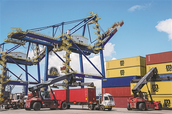 图为在巴西塞阿拉州佩森港的集装箱码头,车辆进行装卸作业。新华社记者 王天聪 摄