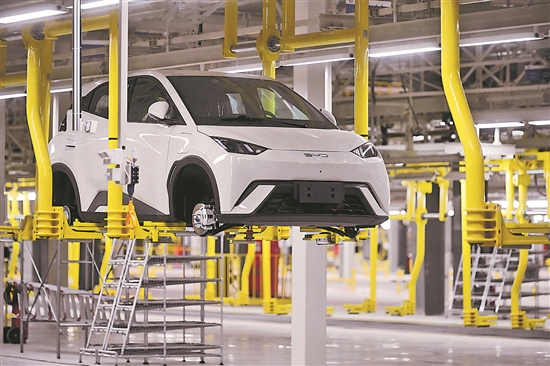 比亚迪巴西乘用车工厂首车下线仪式近日在巴西巴伊亚州卡马萨里市举行。这是近日在巴西巴伊亚州卡马萨里市的比亚迪工厂拍摄的一辆组装中的新能源汽车。