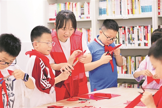 7月3日,志愿者在四川省乐山市市中区王浩儿街道社区爱心暑托班指导学生们剪纸。暑期来临,许多青年志愿者投入志愿服务活动,为社会贡献力量。 新华社发(李华时 摄)