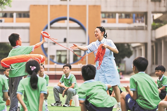 近日,在四川省乐山市一学校,护士为学生传授防溺水自救互救知识。