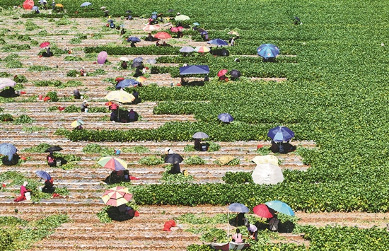 7月2日,安徽省亳州市蒙城县双涧镇老集村农民在采摘毛豆。艳阳下,人们撑着遮阳伞干农活,构成一幅别致的乡村美景。本报通讯员 胡卫国 摄