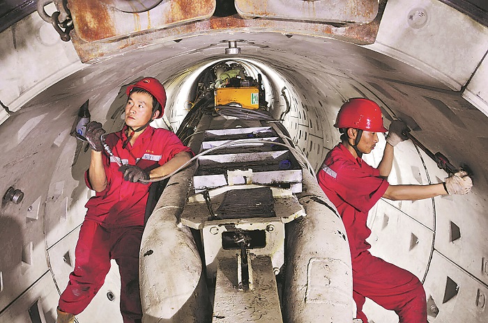7月4日,在山东省烟台市西港区,中国石油管道局建设公司员工在地下18米的盾构隧道内,将6片钢筋混凝土管片严丝合缝地拼装在一起,形成环环相扣的盾构隧道。据悉,烟台港西港区LNG长输管道海域段盾构工程隧道全长1749米,预计需要拼装管片1458环。宋洋 摄