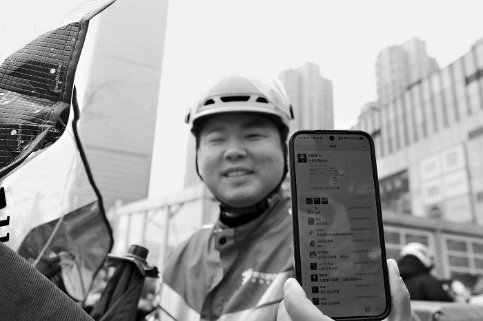 2025年3月5日,杭州一位外卖骑手通过参保审核后,发布微信朋友圈分享喜悦。栾兰 摄/视觉中国