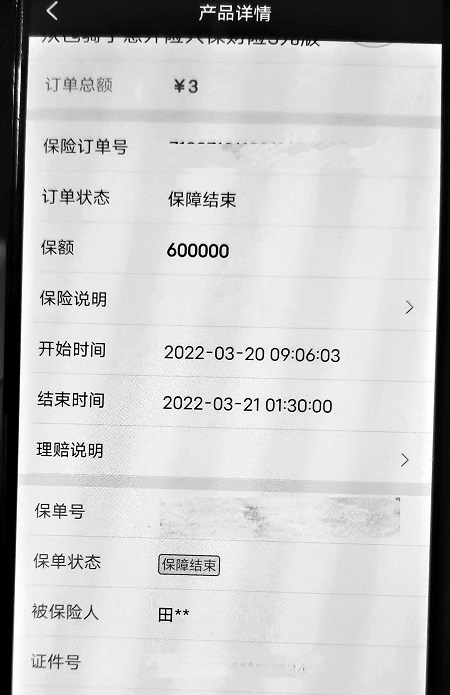 按照平台企业规定,每天完成首单后,田志强都要从获得的配送费中抽出3元在系统里购买一日意外险,2022年3月20日当天也不例外。买保险只需一键操作,但当田志强意外死亡后,他的家人发现想要获得保单中约定的理赔款,难度比想象的大得多。