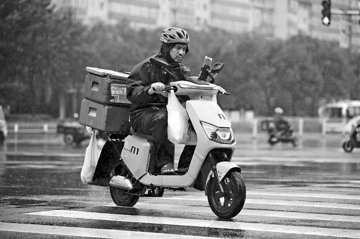 2024年7月30日,北京,一名外卖员在雨中骑行。本报记者 王伟伟 摄