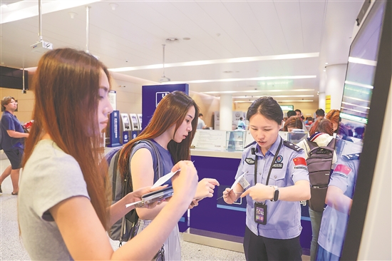 7月8日,在重庆江北国际机场,重庆出入境边防检查总站民警解答入境旅客疑问。