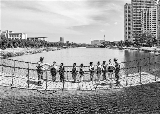 7月2日,在江苏省兴化市昭阳湖公园,兴化市消防救援大队消防员指导学生学习防溺水自救互救的基本知识与技能(无人机照片)。暑假来临,各地开展暑期安全教育主题活动,提高学生们的安全意识和自救自护能力。