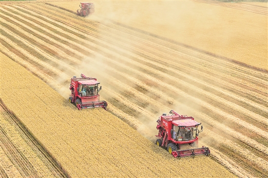 6月9日,河南省三门峡灵宝市西阎乡东古驿村村民在抢收小麦(无人机照片)。