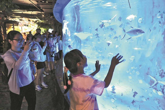 7月9日,江苏南京,新就业形态劳动者子女在海底世界参观游玩。