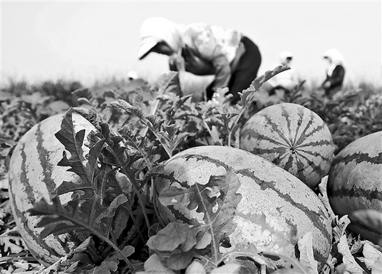 7月9日,河北省唐山市丰南区东田庄镇大吴庄户村的农民在田间收获西瓜。