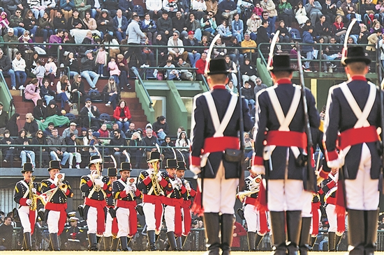 当地时间7月9日,为庆祝阿根廷独立209周年,布宜诺斯艾利斯举行军乐节等系列纪念活动。图为当日在阿根廷首都布宜诺斯艾利斯,军乐队队员参加军乐节表演。
