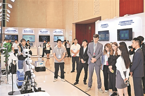 7月11日,参会嘉宾在2025上合组织数字经济论坛互动体验区参观。