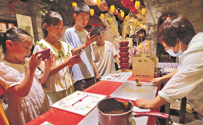 日前,河北省秦皇岛市海港区河东街道工人北里社区小朋友在山海关中国长城博物馆内长城市集体验糖画制作。