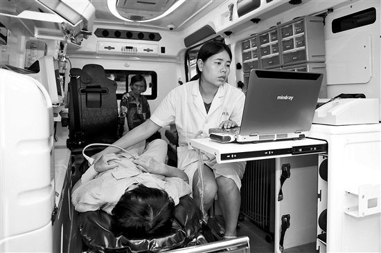 7月8日,浙江省景宁畲族自治县大均乡卫生院医生(右)在巡回诊疗车上为李宝村村民进行B超检查。景宁县地处山区,近年来,当地推出“智慧流动医院”模式,设立78个巡诊点,巡回诊疗车每月定时定点在巡诊点为山区群众开展医疗服务。新华社记者 江汉 摄