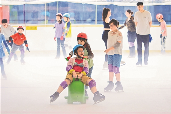 7月13日,小朋友在江苏南京一处室内滑冰场滑冰。