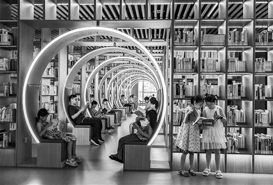 7月13日,学生在浙江省金华市金东区图书馆“时光隧道”长廊书架阅读图书。暑假期间,孩子们参加形式多样活动,畅享缤纷假期。新华社发(时宽兵 摄)