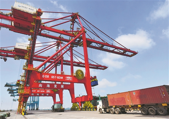 7月16日,工人在黄骅港综合港区集装箱码头操作吊装设备进行装船作业。