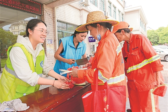 7月15日,安徽省马鞍山市花山区江东街道金瑞社区工会联合新时代文明实践站以及老年人日间照料中心,开展“夏日送清凉”志愿服务活动。社区工作人员及志愿者为辖区30余名环卫工人、保洁员送上绿豆汤、西瓜等消暑物品。本报通讯员 胡智慧 摄