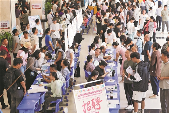 7月13日,江苏省扬州市宝应县举办“荷风送岗·才聚宝地”夏季大型人力资源招聘洽谈会,180家知名企业进行现场招聘,提供制造业、服务业、高新技术产业等行业的3500多个岗位,吸引众多求职者到场应聘。本报通讯员 沈冬兵 摄