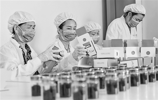 7月14日,在贵州省铜仁市玉屏侗族自治县一家藏红花加工企业,工人在包装藏红花。