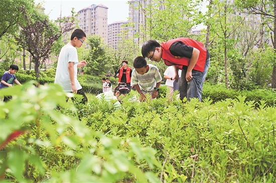 7月17日,返乡大学生志愿者带领公益暑托班的孩子们在福建省屏南县东湖公园开展昆虫科普知识小课堂。
