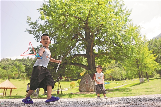 孩子们在甘肃省陇南市徽县嘉陵镇田河村的千年银杏树下玩耍(7月15日摄)。