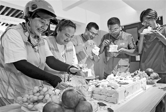 7月17日,河北省秦皇岛市海港区市场监督管理局北港分局“秦快哥”骑手驿站内,外卖配送员正在切蛋糕。